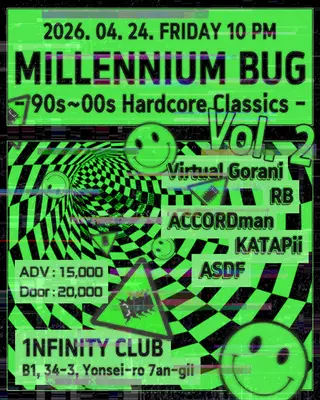 MILLENNIUM BUG Vol. 2 on April 24, 2026 at 1nfinity Club, Seoul features electronic music performances hardcore DJ sets.