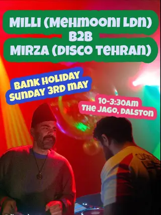 Milli (MEHMOONI LDN) B2B MIRZA (DISCO TEHRAN) ALL NIGHT LONG takes place at The Jago in London, United Kingdom on May 3, 2026. Featuring Milli. Disco and Experimental sounds all night.