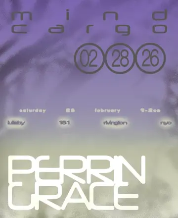 Mind Cargo takes place at Lullaby in New York City, Unknown on Saturday, February 28, 2026. Featuring Perrin Grace. Techno, Minimal.
