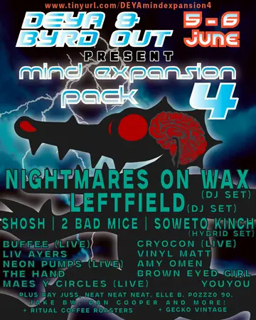 Mind Expansion Pack 4 takes place at Deya Brewery in Brussels, Belgium on Friday, June 5, 2026. Featuring Nightmares on Wax, Leftfield, 2 Bad Mice, youyou and 3 more. Disco, Acid.
