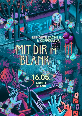 MIT DIR im Blank with Kopfkultur & Gute Sache e.V takes place at ://about blank in Berlin, Germany on May 16, 2026. Featuring Eliza Minelli, junoia, Ligal Tamir, COGNAC200 and 6 more.