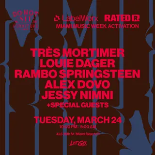 Do Not Sit On The Furniture in Miami, United States hosts MMW Activation on March 24, 2026. Featuring Rambo Springsteen, Alex Dovo. Expect House and Deep House throughout the night.