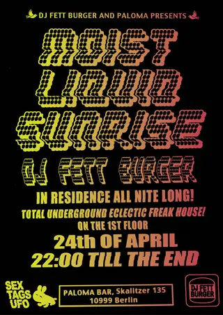 Moist Liquid Sunrise takes place at Paloma in Berlin, Germany on April 24, 2026. Featuring DJ Fett Burger.