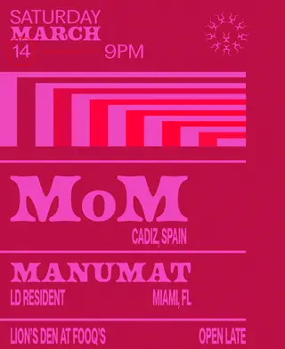 MoM, Manumat on March 14, 2026 at Lion's Den, Miami features MoM (4) and Manumat performing DJ sets.