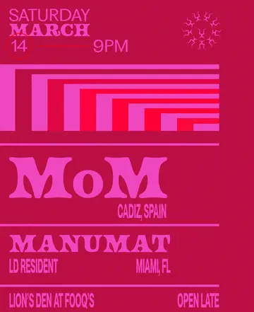 Lion's Den in Miami, United States presents MoM, Manumat 2026, a curated electronic music experience on Saturday, March 14, 2026, featuring MoM (4) and Manumat. This event brings together artists and fans who share a passion for dance music culture and electronic sounds.