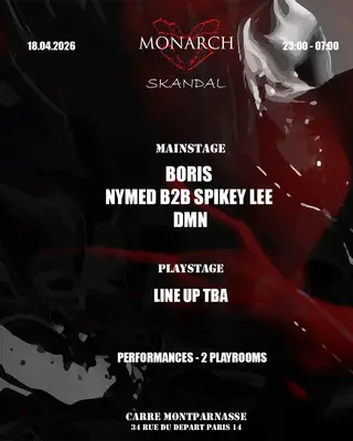 MONARCH - SKANDAL on April 18, 2026 at TBA - Carré montparnasse - 34 rue du Départ, 75014 Paris, Paris features Boris, Nymed, Spikey Lee and DMN DJ performing techno DJ sets.