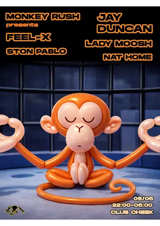 Monkey Rush presents: Jay Duncan, Feel-X, Lady Moosh, Ston Pablo takes place at Club Cheek in London, United Kingdom, on June 5, 2026. Jay Duncan is known for his work within the tech house genre and has made a name for himself in the electronic music scene. Feel-X brings a blend of acid and tech house sounds, contributing to the night's diverse lineup. Lady Moosh is recognized for her energetic sets, often incorporating elements of tech house. Ston Pablo rounds out the lineup with a focus on acid house, showcasing his intricate production style. The event will feature a mix of tech house and acid, highlighting the distinct sounds of each artist.