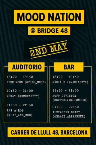 Mood Nation takeover BRIDGE 48 takes place at Bridge 48 in Barcelona, Spain on May 2, 2026. Featuring Moray, Pier Mood, Raf & Rod. Deep House and Electronica sounds all night.