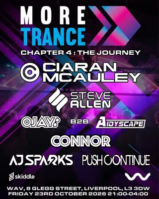 More Trance - Chapter 4: The Journey takes place at WaV in Liverpool, United Kingdom, on October 23, 2026. This event features a lineup focused on the trance genre. Ciaran McAuley is a noted trance producer and DJ from Northern Ireland, known for his melodic and uplifting sound. Connor is an emerging UK artist recognized for his contributions to the trance scene. Both artists will present sets that highlight the dynamic range of trance music.