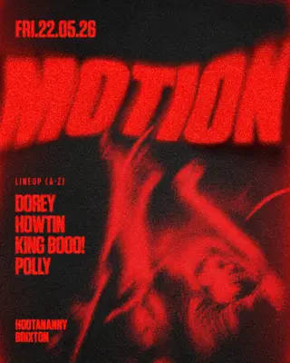 Motion: Dorey, Howtin, KING BOOO! + Polly at Hootananny Brixton in London, United Kingdom on May 22, 2026. Featuring KING BOOO!. Bass and UK Funky sounds all night.