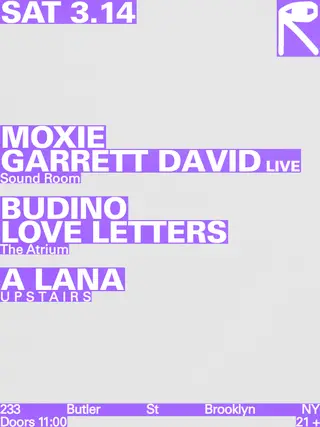 Moxie + Garrett David [Live] / Budino + Love Letters / A lana takes place at public records in New York, United States on March 14, 2026. Featuring Moxie, Garrett David, Budino, Love Letters and 1 more. House and UK Garage sounds all night.