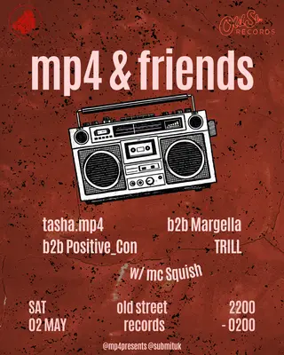 mp4 and friends X Submit: Basement Takeover (UKG, Grime, House) on May 2, 2026 at Old Street Records, London features tasha.mp4, Positive_Con, Margella and TRILL (UK) performing garage DJ sets.