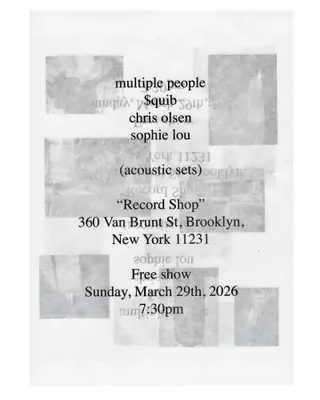 Multiple People, $quib, Chris Olsen, Sophie Lou takes place at Record Shop in New York, United States on March 29, 2026. Featuring Multiple People. Experimental sounds all night.