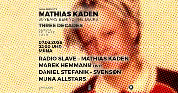 Muna pres: Mathias Kaden - 30 Years behind the decks takes place at Muna in Jena, Unknown on Saturday, March 7, 2026. Featuring Radio Slave, Marek Hemmann, Mathias Kaden, Daniel Stefanik and 1 more. Techno, House.