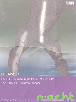 NACHT takes place at Faust in Seoul, South Korea on May 1, 2026. Featuring Suman, Mars Parck, NUSNOOM, Nocturnal (KR) and 1 more.