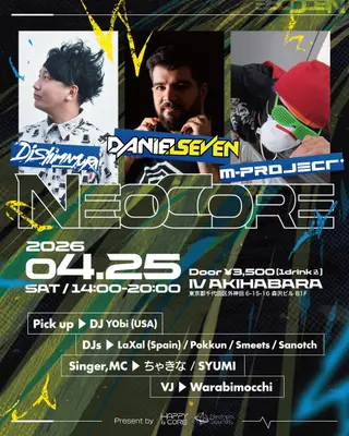 NEOCORE takes place at Akihabara IV in Tokyo, Japan on April 25, 2026. Featuring Daniel Seven, DJ Shimamura, M-Project, DJ Y0bi. Hardcore and Club sounds all night.