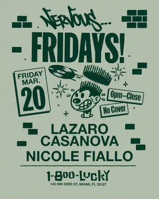 Nervous Fridays! Lazaro Casanova, Nicole Fiallo takes place at 1-800-Lucky in Miami, United States on March 20, 2026. Featuring Lazaro Casanova, Nicole Fiallo. House and Afro House sounds all night.