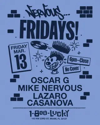 Nervous Fridays! Oscar G, Mike Nervous, Lazaro Casanova takes place at 1-800-Lucky in Miami, United States on March 13, 2026. Featuring Oscar G, Mike Nervous, Lazaro Casanova. House and Afro House sounds all night.