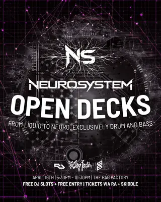 The Bag Factory in Manchester, United Kingdom presents NEUROSYSTEM Drum and Bass Open Decks 2026, a curated electronic music experience on Thursday, April 16, 2026. This event brings together artists and fans who share a passion for dance music culture and Drum & Bass, Dubstep sounds.