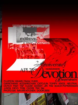 neutral presents. DEVOTION 2nd anniversarry takes place at Aoyama Hachi in Tokyo, Japan on April 25, 2026. Featuring FUJIMON. Techno and House sounds all night.