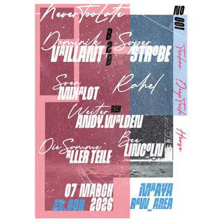 NeverTooLate takes place at Maaya in Berlin, Germany on March 7, 2026. Featuring Superstrobe, Dominik Vaillant, Doyle Shepherd, Andy Walden and 1 more. Techno and Minimal Techno sounds all night.
