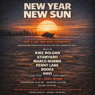 NEW YEAR, NEW SUN BOAT PARTY on December 31, 2025 at TBA - Opus Boat (601 biscayne blvd, miami, fl, 33132), Detroit features Kike Roldan, Atomyard, Penny Lane and Boogs (2) performing house DJ sets.