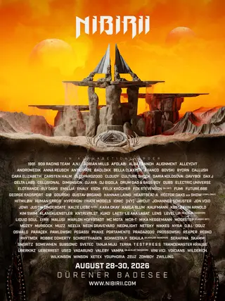 NIBIRII Festival 2026 on August 28, 2026 at Dürener Badesee, Cologne features 1991 (UK), 909 RACING TEAM, A.N.I., AKKI (DE), Alba Franch, Alignment, Andromedik, Anna Reusch, Badlokk, Bella Claxton, BIIANCO, BOVSKI, CALLUSH, Cara Elizabeth, Carsten Halm, Cleopard2000, Cloudy, Culture Shock, Daria Kolosova, davyboi, DAX J, DELTA LABS, Dimension, DJ AYA, DJ Gigola, Elotrance, Ely Oaks, EMILIJA, Enaly, Esch, Felix Kröcher, future.666, Gustav Ørgano, Hannah Laing, Héctor Oaks, HUMAN ERROR, I Hate Models, Johannes Schuster, Jon Void, Justin Tinderdate, Karla Blum, Kaufmann, KIM SWIM, KlangKuenstler, KNTRLVRLST, KUKO, LB aka LABAT, Lens (2), Liquid Soul, LYNE, MALUGI, Marlon Hoffstadt, MCR-T, Mika Heggemann, Mr.Black (UK), Murdock, Neon Graveyard, Neonlight, Netsky, Nyra, Paraçek, Pawlowski (UK), Pegassi, Portamento, PRADA2000, Prossowski, Reaper, RHYTMOX, Robbie Doherty, Schrotthagen, Schwesta P, snoritz, Somewhen, Svetec, TANJA MIJU, Terra, t e s t p r e s s, Ueberrest, Used, Vagabund, Valeby, Voicians, WILDERÍCH, Wilkinson, Winson, ZEUZ and Zomboy performing techno DJ sets.