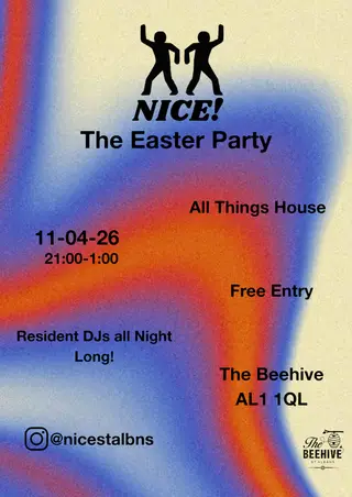 Nice! at The Beehive: The Easter Party takes place at TBA - The Beehive St Albans AL1 1QL in London, United Kingdom on April 11, 2026. Featuring Mack Gibson. House sounds all night.