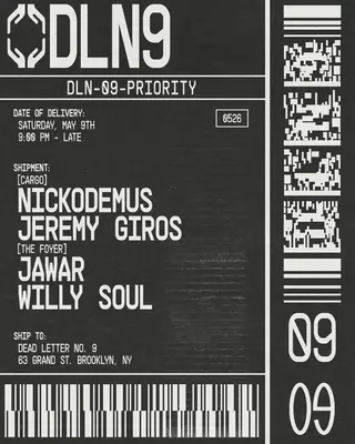 Nickodemus, Jeremy Giros, Jawar, Willy Soul - Dead Letter No.9 takes place at Cargo @ Dead Letter No. 9 in New York City, United States on May 9, 2026. Featuring Nickodemus, JAWAR (3), Willy Soul, Jeremy Giros. Techno and House sounds all night.