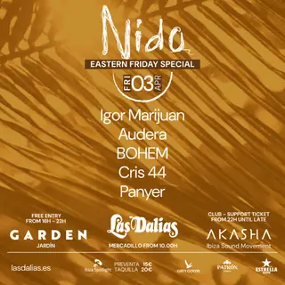 Nido Easter Edition takes place at Akasha Las Dalias Club - Ibiza in Ibiza, Spain on April 3, 2026. Featuring Igor Marijuan, Audera, BOHEM, Panyer.