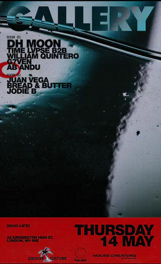 Nights at Gallery in London, United Kingdom, features a lineup focused on tech house. The event takes place on May 14, 2026. Headlining the night is DH Moon, known for his deep grooves and minimalistic approach to tech house. TIME LVPSE, an emerging artist in the scene, brings a fresh perspective with his innovative sound design. William Quintero, a producer with a solid reputation for his rhythmic patterns, makes a return to the UK dance floors, showcasing his distinctive style. Bread & Butter rounds out the lineup, known for their energetic sets that blend classic house elements with modern influences.