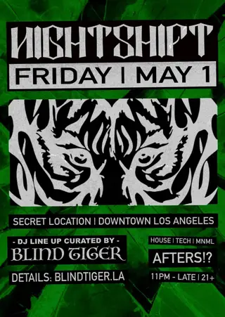 NIGHTSHIFT AFTER HOURS on May 1, 2026 at TBA - DM @NIGHTSHIFT.LA ON INSTAGRAM FOR ADDRESS, Los Angeles features electronic music performances tech house DJ sets.
