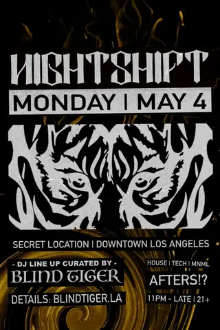 NIGHTSHIFT AFTER HOURS on May 4, 2026 at TBA - DM @NIGHTSHIFT.LA ON INSTAGRAM FOR ADDRESS, Los Angeles features electronic music performances tech house DJ sets.