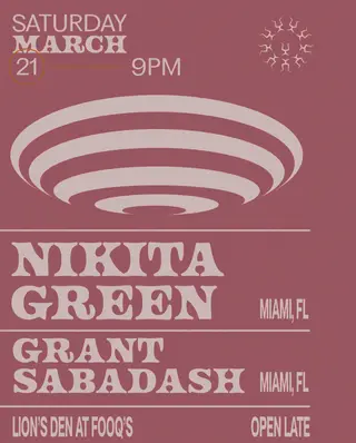 Nikita Green, grant sabadash on March 21, 2026 at Lion's Den, Miami features Nikita Green and grant sabadash performing DJ sets.