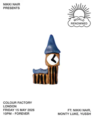 Nikki Nair presents World Renowned w/ Monty Luke & Yushh on May 15, 2026 at Colour Factory, London features Nikki Nair, Monty Luke and Yushh performing house DJ sets.