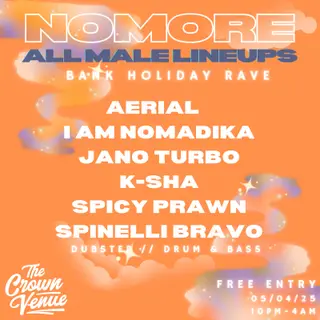 No More All Male Lineups: Aerial, I Am Nomadika, Jano Turbo, K-Sha + more on April 5, 2026 at The Crown, Bristol features Aerial and Spinelli Bravo performing drum & bass DJ sets.