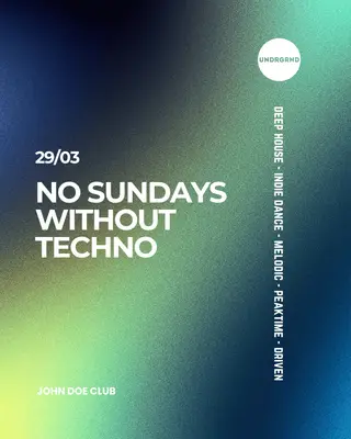 No Sundays Without Techno takes place at John Doe in Amsterdam, Netherlands on March 29, 2026. Featuring Alex Sharp. Techno sounds all night.