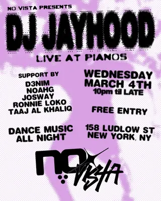 No Vista presents: DJ Jayhood + more on March 4, 2026 at Pianos, New York features D3NIM, Ronnie Loko, NoahG and Taaj Al Khaliq performing DJ sets.