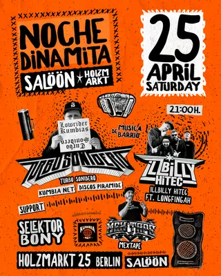 Noche Dinamita - iLLBiLLY HiTEC feat. Longfingah / Turbo Sonidero / Mextape / Selektor Bony takes place at Salöön (Säälchen/Holzmarkt 25) in Berlin, Germany on April 25, 2026. Featuring Longfingah. Dub, Latin Bass.