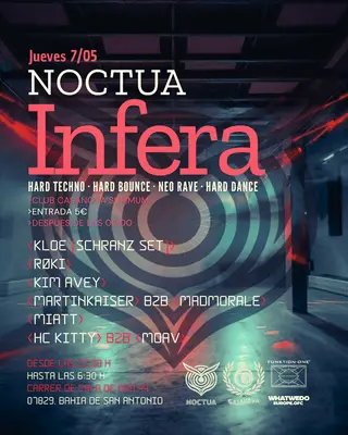 Noctua Infera [HARD TECHNO] takes place at Summum in Ibiza, Spain on May 7, 2026. Featuring KLOE. Techno and Industrial sounds all night.