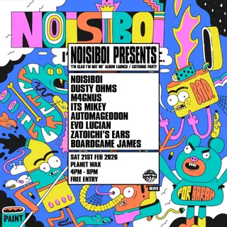 Noisiboi 'I'm Glad I'm Not Me' Album Launch / Listening Party takes place at Planet Wax in London, United Kingdom on February 21, 2026. Featuring Noisiboi, Dusty Ohms. Hip-Hop and Experimental sounds all night.