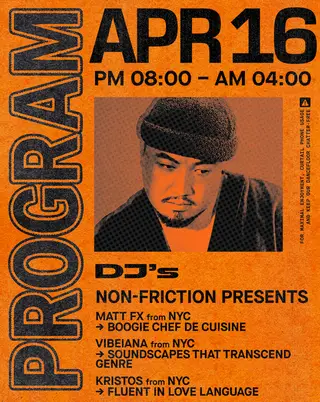 Non-Friction Records presents: Matt FX & Friends on April 16, 2026 at Outer Heaven, New York City features Matt FX and Vibeiana performing house DJ sets.