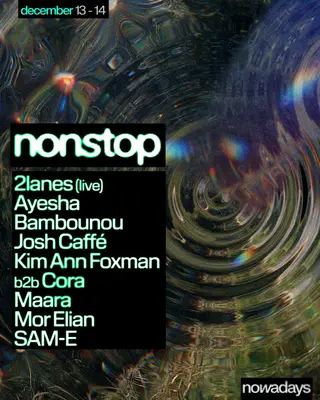 Nonstop: 2Lanes, Ayesha, Bambounou, Cora, Josh Caffé, Kim Ann Foxman, Maara, Mor Elian, SAM-E takes place at Nowadays in New York, United States on December 13, 2025. Featuring 2Lanes, Mor Elian, Ayesha, Bambounou and 4 more. Breaks and House sounds all night.