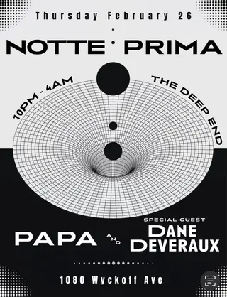 Notte Prima: Dane Deveraux & Papa takes place at The Deep End in New York, United States on February 26, 2026. Featuring Dane Deveraux, PAPA (US). Progressive House and House sounds all night.
