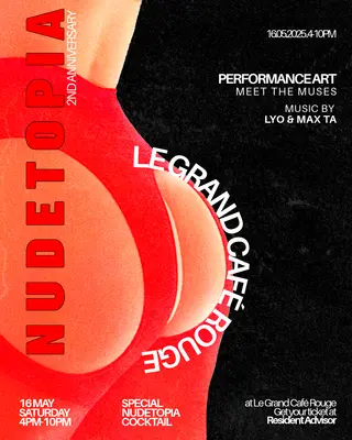NUDETOPIA 2nd Anniversary at Le Grand Cafè Rouge takes place at TBA - Le Grand Cafè Rouge in Barcelona, Spain on May 16, 2026. Featuring Lyonel, Max TA. Experimental sounds all night.