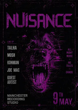 Nuisance at TBA - Manchester recording studios (Hulme) in Manchester on Saturday, May 9, 2026. The event focuses on Drum & Bass music.
