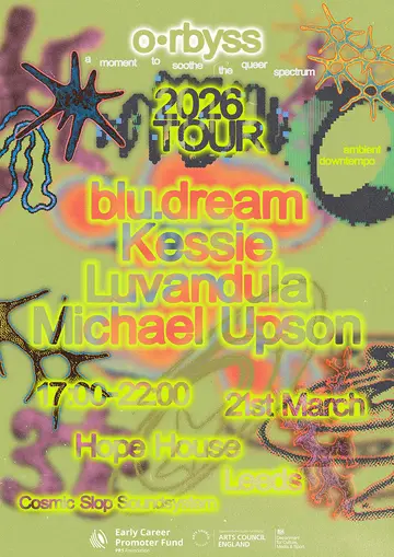 o•rbyss at Hope House - a moment to soothe the queer spectrum takes place at Hope House in Paris, France on Saturday, March 21, 2026. Featuring Michael Upson, Kessie, luvandula. Ambient, Downtempo.