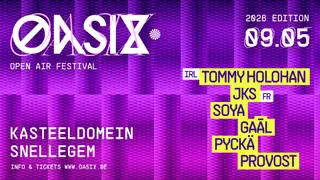Oasix Festival 2026 on May 9, 2026 at Kasteeldomein van Snellegem, Brakel features Tommy Holohan, JKS and SOYA performing techno DJ sets.
