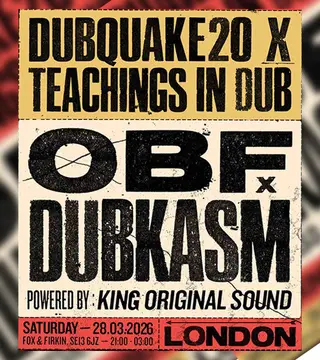 OBF x Dubkasm ft King Original Sound, Kaya Fyah & Ras D on March 28, 2026 at The Fox and Firkin, London features O.B.F, Dubkasm and Footsie performing dub DJ sets.