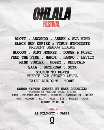 OHLALA SUMMER FESTIVAL 2026 takes place at Le Kilowatt in Paris, France on Saturday, June 13, 2026. Featuring Black Sun Empire, Blooom, Dodge & Fuski, Hamdi and 4 more. Drum & Bass, Dubstep.